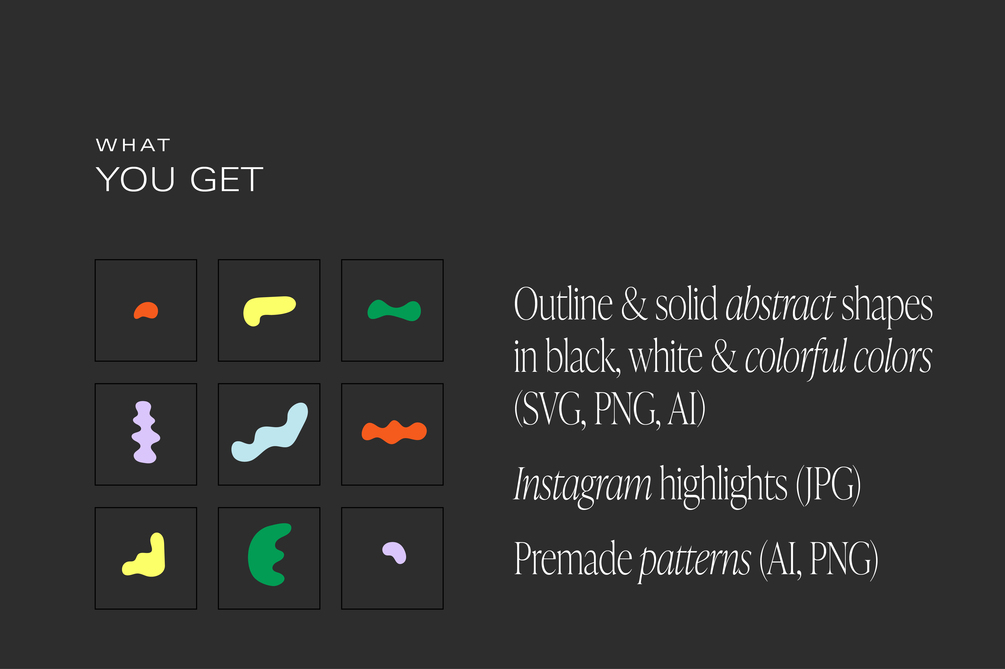 A design set of abstract shapes and patterns! These colorful streamlined design assets will add depth and sophistication to your next project. Ideal for both print and digital design from packaging, labels, branding, textiles, clothing, stationery, invitations, posters, frames, banners, ads, wall art, instagram highlights, blogs, social media, websites and more!